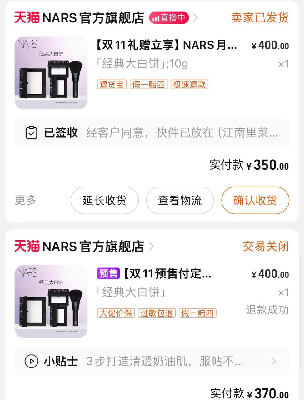 比如,有网友分享了一款粉饼,预售价格为优惠后370元,而购买现货,价格只需要350元。