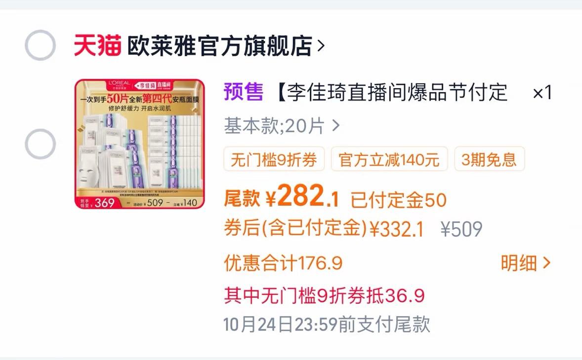 10月21日,有网友在网上吐槽:“从来没见过尾款钱还变的,直播间券也领了,9折也选了,事实就是涨价了。”这位网友原本准备购买一款预售的欧莱雅面膜,支付定金50元后显示尾款为248.89元。后来却发现尾款变成了282.1元。因为尾款价格出现变化,网友没有支付,退款后,发现买两箱价格较为便宜,便重新下单。