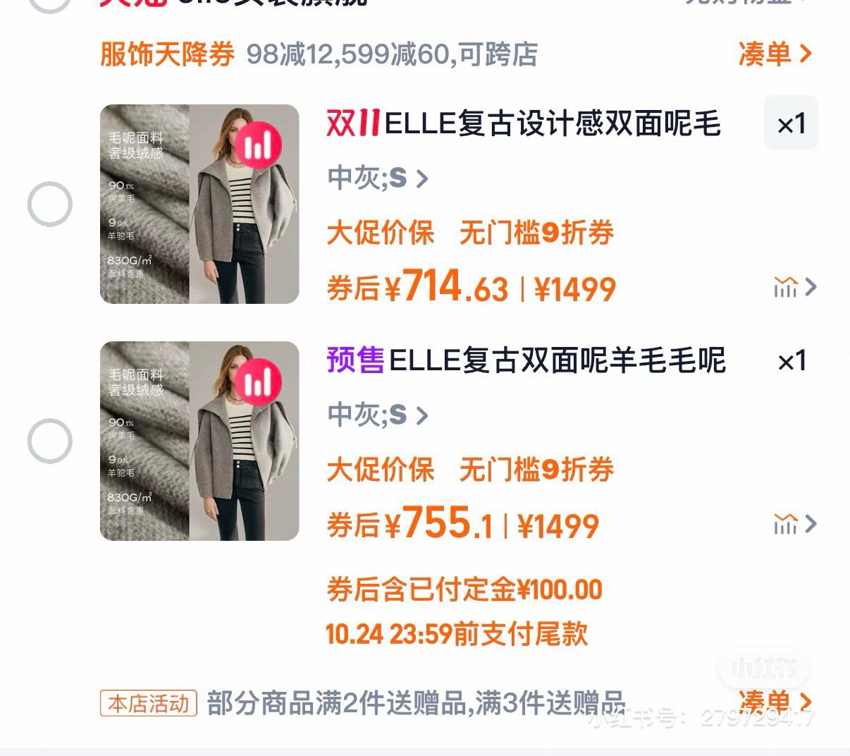还有网友分享自己准备购买的毛呢外套,预售价格为755.1元,而现货价格为714元。